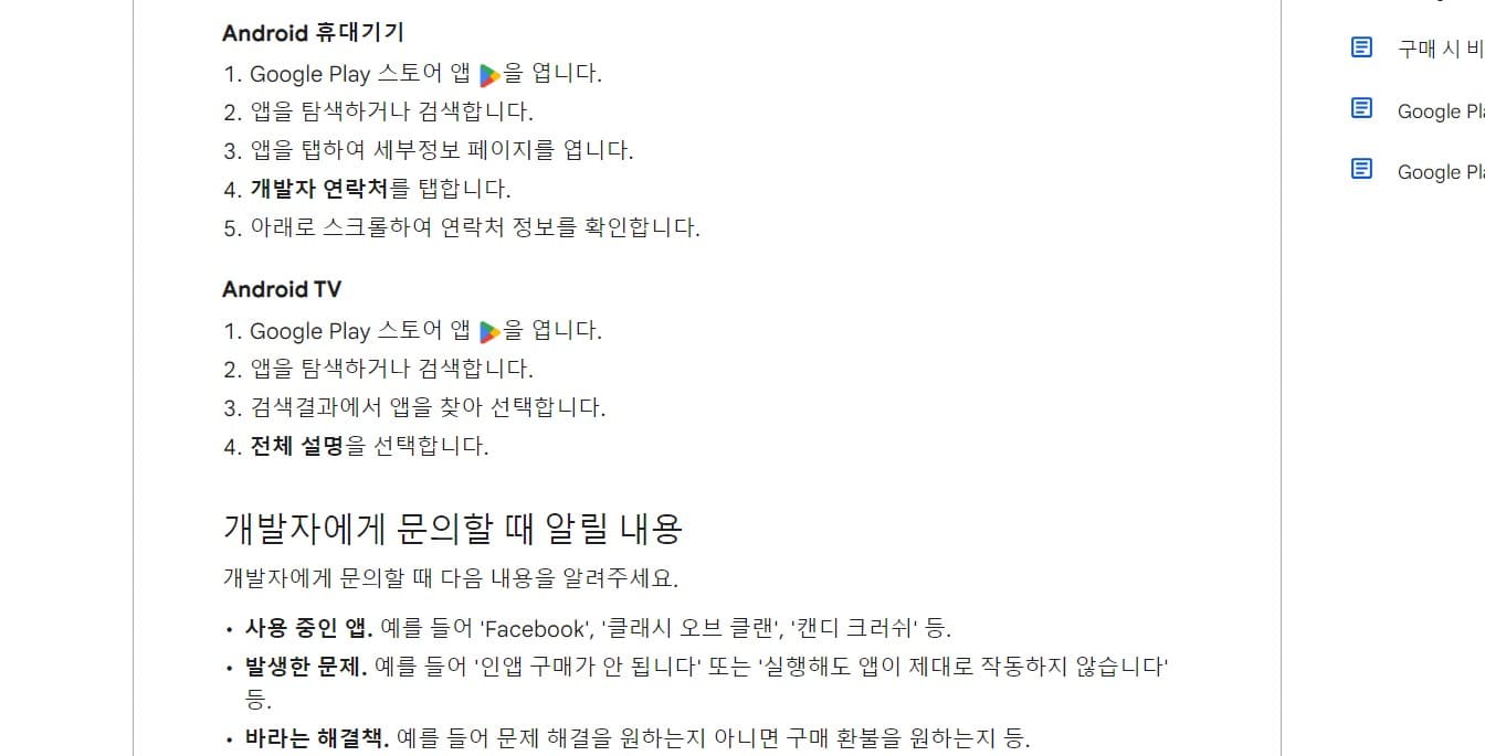 48시간이 지나면 개발자나, 개발회사에 문의를 해야한다고 알려드렸습니다. 그 방법을 알아보겠습니다. 구글플레이 pc버전을 기준으로 알려드리겠습니다. 구글플레이 사이트 > 환불원하는 어플 검색 > 앱선택 > 세부정보 페이지 > 아래로 내려서개발자 연락처를 찾음.