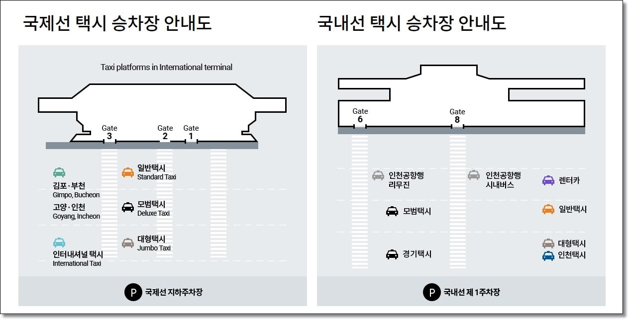 국내선을 타고 나와서 택시를 탈 수 있는 곳은 6번 , 8번 게이트로 나가시면 횡단보도를 건너 택시를 탈 수 있습니다. 택시의 종류는 모범택시, 경기택시, 일반택시, 대형택시, 인천택시가 있습니다.