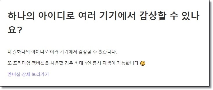 광고 없이 시청 가능 / 프로필 4개 만들 수 있음, 동시재생도 4개까지 / 최신 업데이트 영상 시청가능 / 다운로드 기능 사용 / 화질 fhd / tv 어플 사용