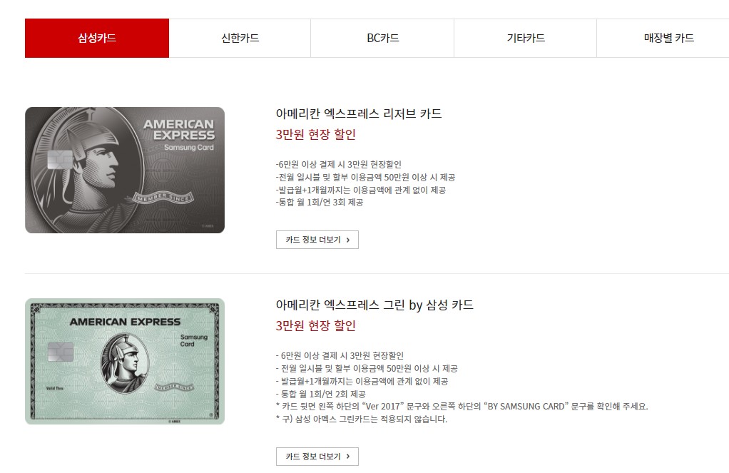 현대 아메리칸 익스프레스 더 플래티넘 카드 / HERITAGE Reserve (포인트형) / HERITAGE Reserve (스카이패스형) / 현대 아메리칸 익스프레스 골드 카드 / 현대 아메리칸 익스프레스 그린 카드 / 하나 CLUB H 아메리칸 익스프레스 리저브 카드 / 롯데 아멕스 플래티늄 위버 스카이 카드 / 롯데 아멕스 플래티넘 법인카드 / 현대카드 H / 광주카드 / KB국민 쇼핑 캐쉬백 카드 / 하나 Juliet 카드 / 하나 The One 카드(신용/체크) / 하나카드 플래티늄 1200 / 하나카드 EXPAT 플래티늄