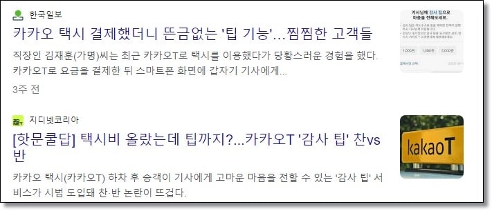 바로 택시를 타고 나오면 화면에 기사님께 팁을 줄수 있게 기능이 생겼습니다. 1000원, 1500원, 2000원을 선택해서 팁을 줄 수 있습니다. 카카오택시는 카카오맵을 기준으로 주행하게 되는데 빠른 길로 유도하지 않는다고 느낄때가 많았습니다. 여기서 팁까지 생겨버리니 고객들의 반응이 긍정적이지는 않을 것으로 보입니다.