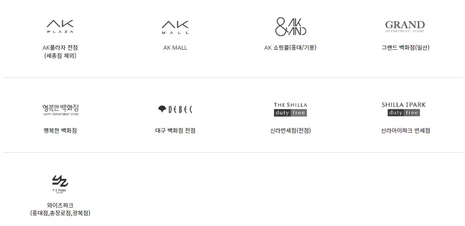 AK플라자 전점(세종점 제외) / AK MALL / AK 쇼핑몰(홍대/기흥) / 그랜드 백화점(일산) / 행복한 백화점 / 대구 백화점 전점 / 신라면세점(전점) / 신라아이파크 면세점 / 와이즈파크(홍대점,충장로점,광복점)